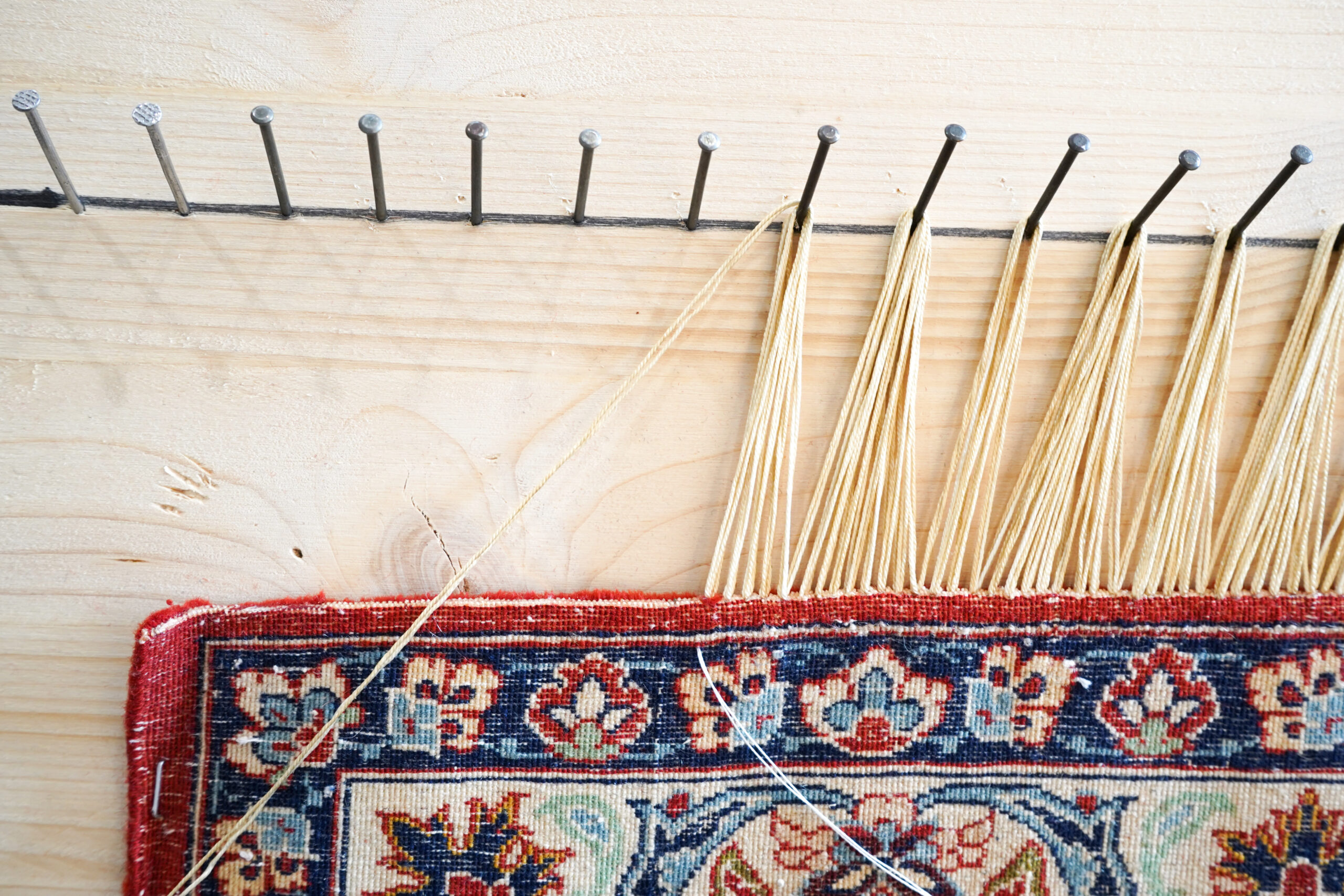 Als nächstes erfolgt die Aufbürstung des Teppichflors. Dadurch wird der charakteristische Licht-/Schatteneffekt der wertvollen Teppiche erhalten. Die Fransen werden in diesem Schritt ebenfalls gebürstet.